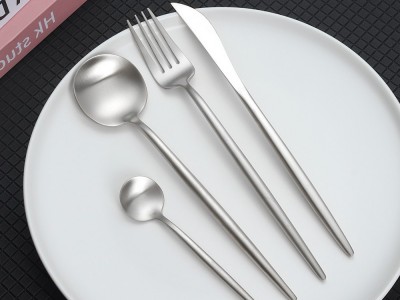 网红餐厅勺子304不锈钢轻奢ins复古圆柄哑光做旧葡萄牙牛扒刀叉勺