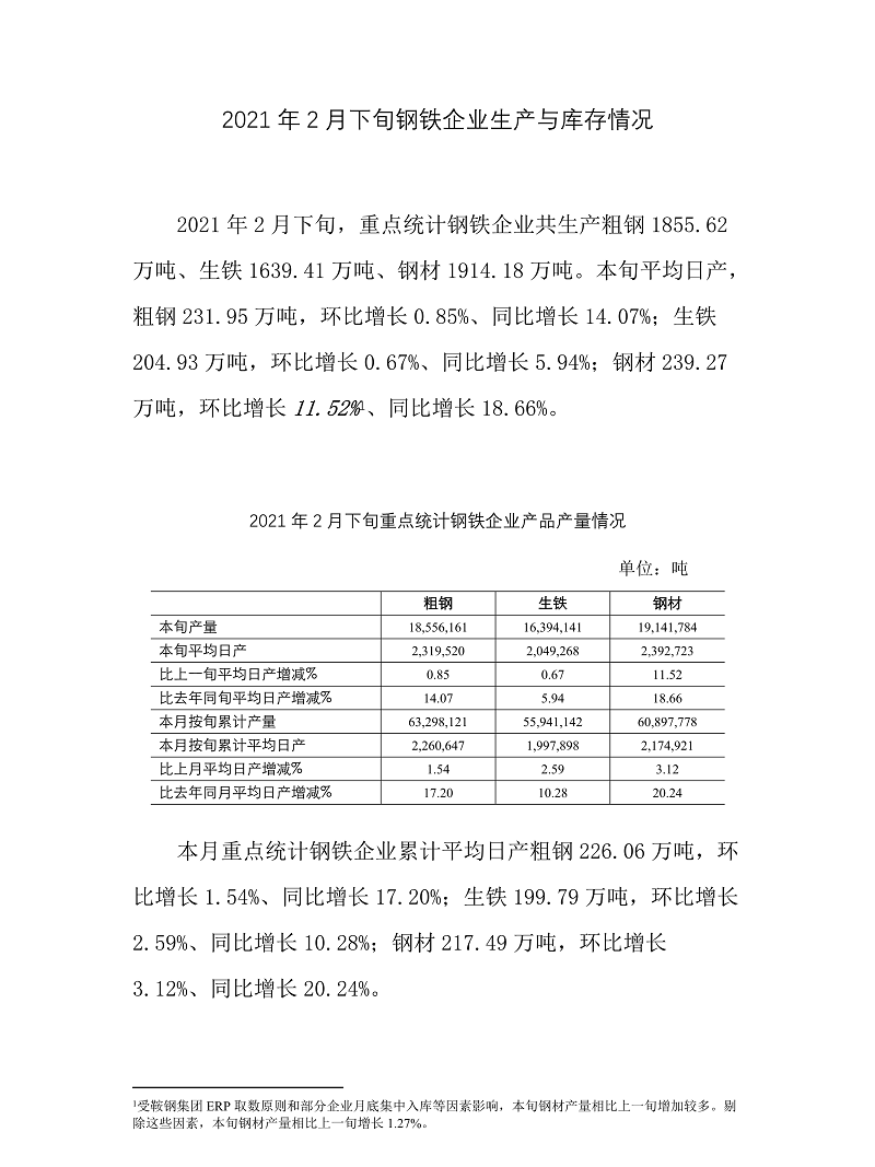 据中钢协最新数据显示,2021年2月下旬,重点钢企粗钢日均产量231.95万吨,环比增长0.85%。
