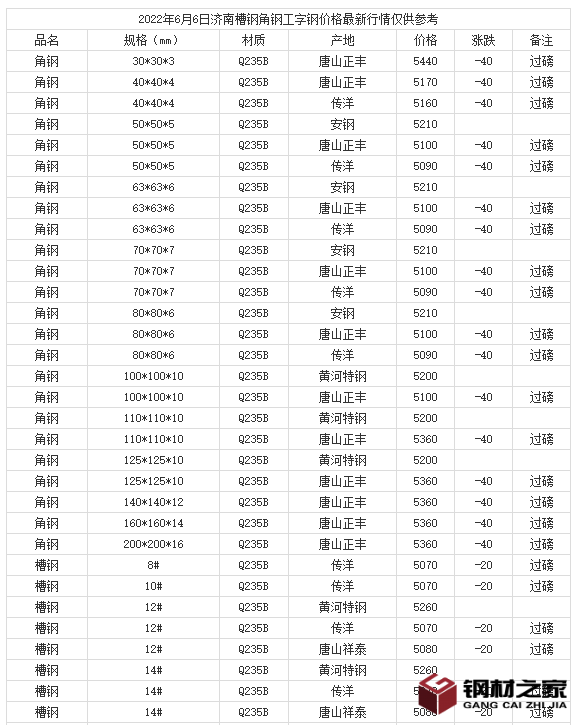 2022年6月6日济南槽钢角钢工字钢价格最新行情