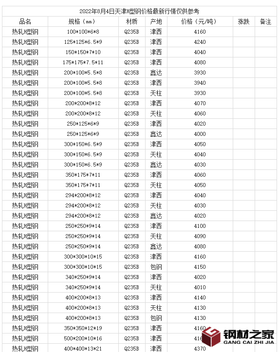 2022年8月4日天津H型钢价格最新行情